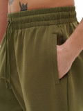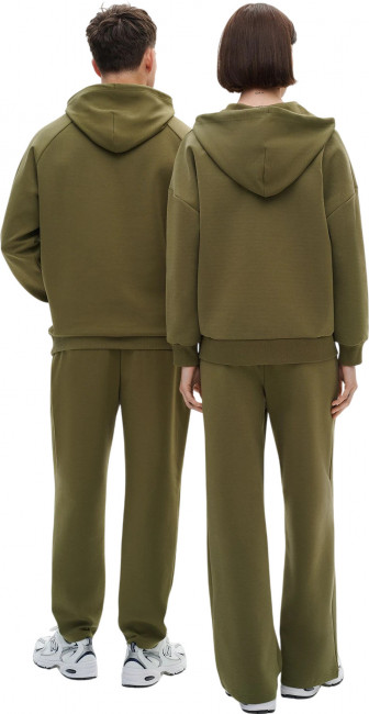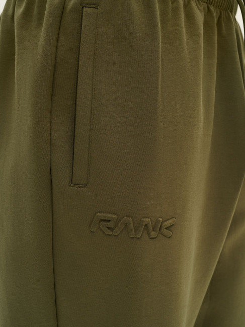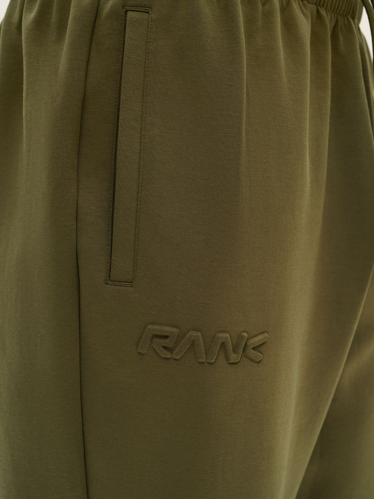 Ткань Interlock, состоящая из 77% хлопока, 16% полиэстера и 7% эластана — плотное полотно двойного переплетения, сохраняющее форму и приятное на ощупь. Прямой слегка широкий силуэт обеспечивает свободу движений и современный внешний вид. Регулировка посадки с помощью наружных круглых шнурков с пластиковыми наконечниками. Объёмный эмбосс-принт справа под карманом выполнен методом термопрессования: выпуклый снаружи и плоский изнутри. Два боковых кармана без молний, оформленные листочками в цвет ткани, удобны для мелочей. Материал сохраняет форму, подчёркивает силуэт и остаётся комфортным при длительной носке.